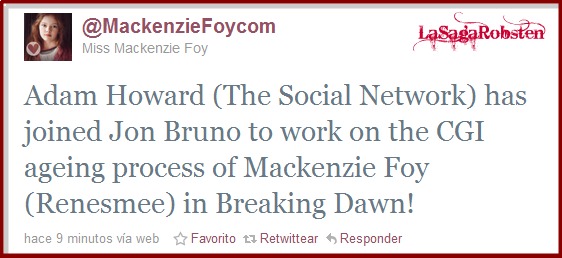 “Adam Howard ("A Rede Social") entrou com Jon Bruno para trabalhar no processo de envelhecimento CGI de Mackenzie Foy (Reneesme) em "Amanhecer"!”