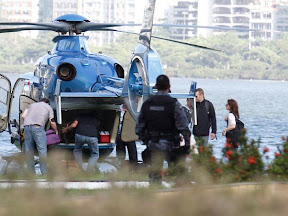 Os atores embarcaram nesta segunda-feira, 08/11, no heliponto da Lagoa Rodrigo de Freitas, no Rio.